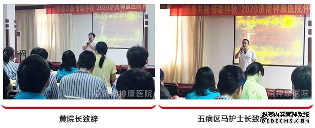 联欢会伊始,由黄院长致辞,代表神康医院送给大家满满的中秋祝福,也感谢全体医患人员的支持与配合,同时鼓励医护工作者在今后工作中再接再厉,帮助患者早日康复。