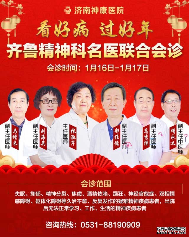 节前看好病,健康过大年!济南神康医院精神科专家联合会诊活动全面启动!1月16至17日,“SK医康一体”学科带头人、原山东省精神卫生中心郝维德主任,原山东省精神卫生中心主任医师、济南神康医院张淑芹院长领衔,共同开展“多对一”联合会诊,为患者制定个性化诊疗方案,让更多患者能够在年前解决反复发作、病因不明、社会功能受限等问题。活动期间每日专家号限额20名,需提前预约!预约电话0531-88190909。