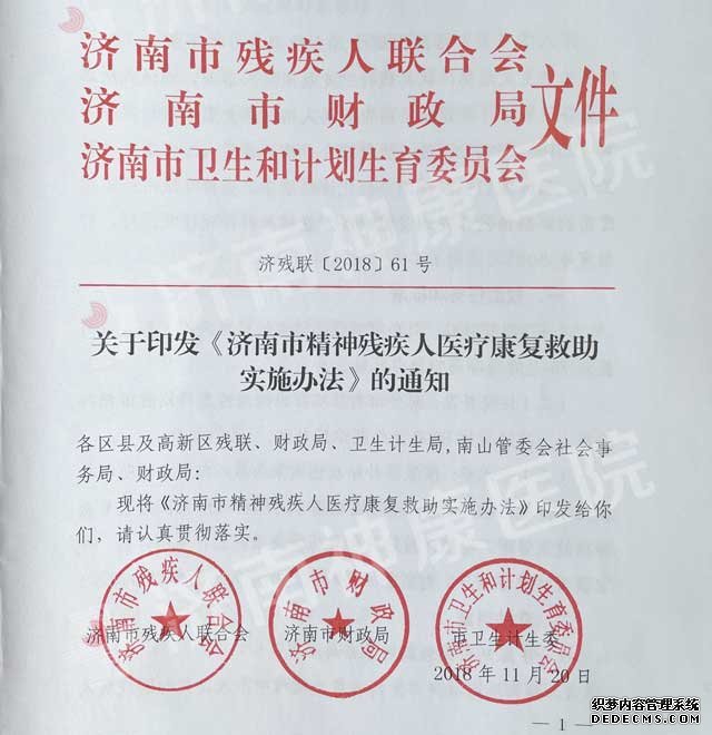 为切实解决济南市精神残疾人康复难的问题,使其能够就近接受康复服务,近日,根据《济南市精神残疾人医疗康复救助实施办法》要求,结合全市精神残疾人医疗康复救助工作实际,经济南市残疾人联合会与济南市卫生健康委员会的专家组联合评定,济南神康医院各项指标达标,经市残疾、市卫健委共同研究决定,授予济南神康医院“济南市精神残疾人医疗康复救助项目定点机构”。